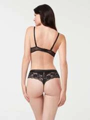 – Détail de satin en forme de « V » au dos avec 3 mini-boutons noirs sur une fine bande de tulle